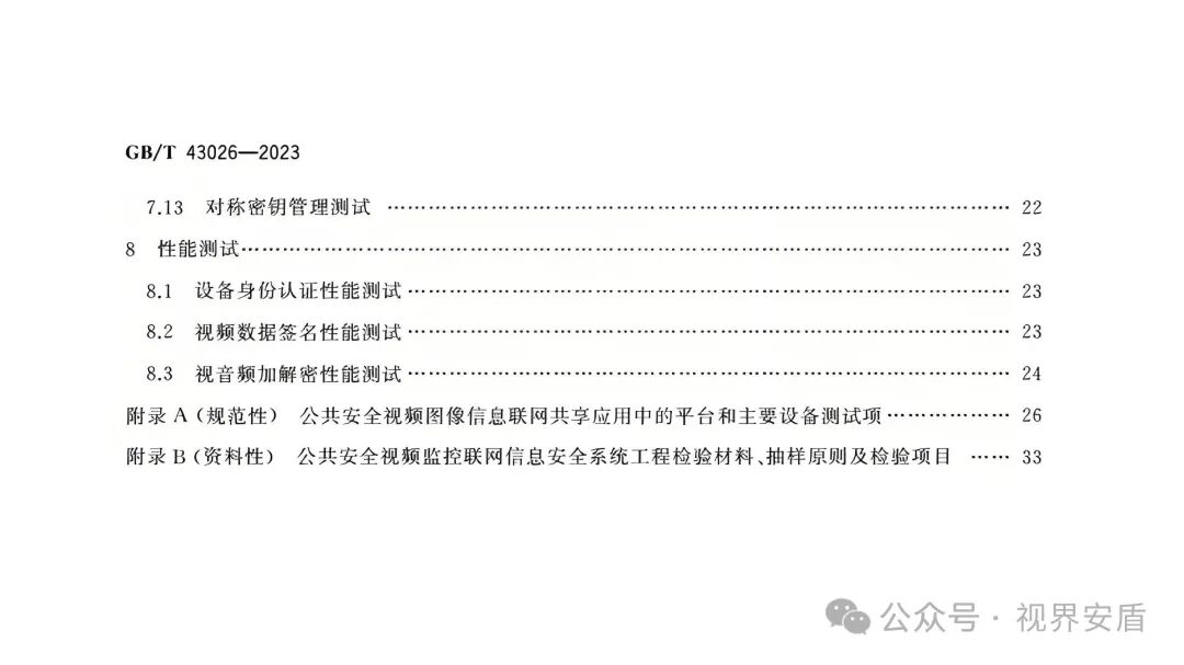 性能测试部分(标准第8章)对应GB 35114-2017第7章,重点包括设备身份认证性能、视频数据签名性能、视频加密与解密性能等。测试方法中涉及视频签名与加密的部分,依据GB/T 25724-2017的相关技术要求执行。